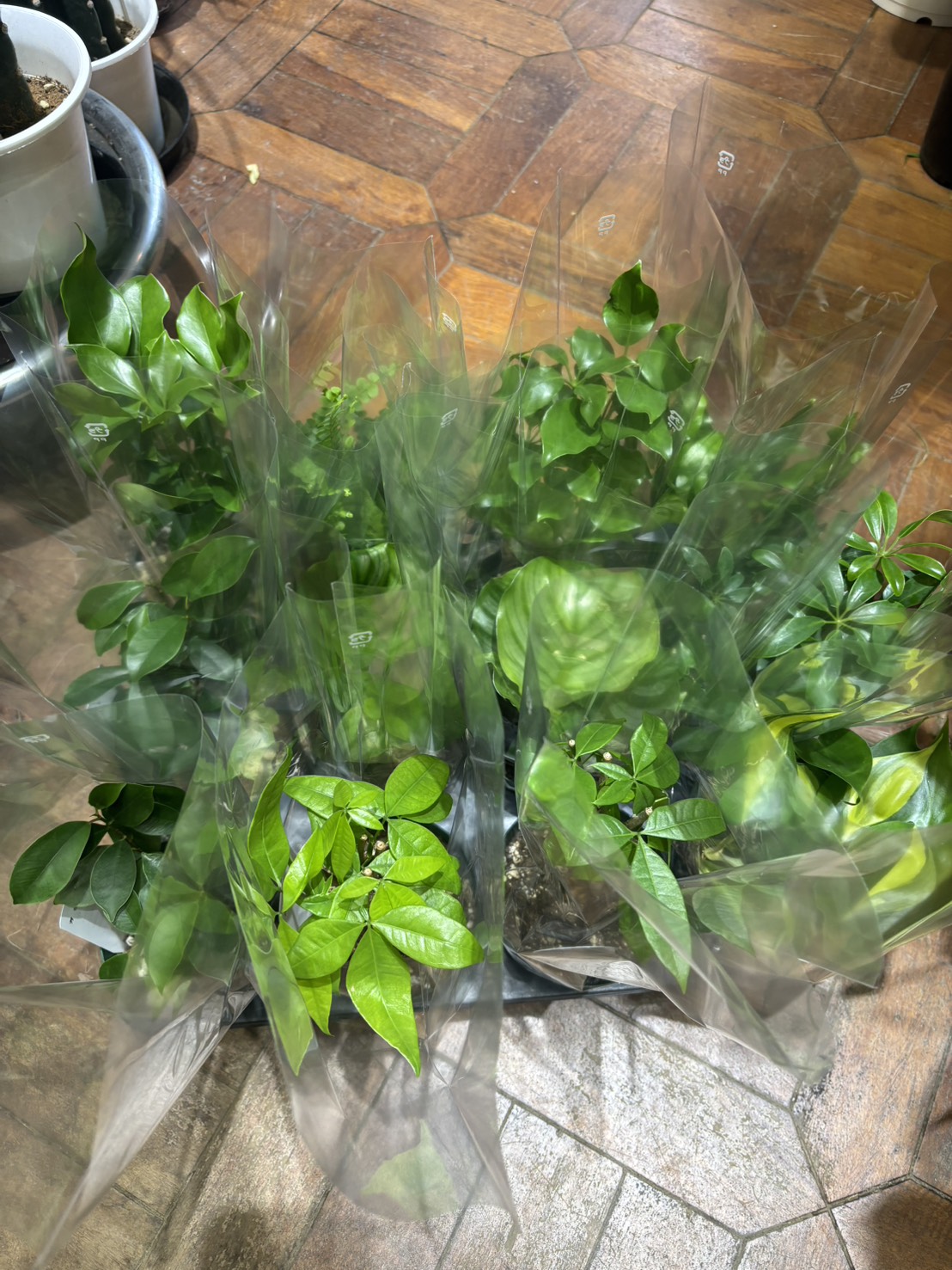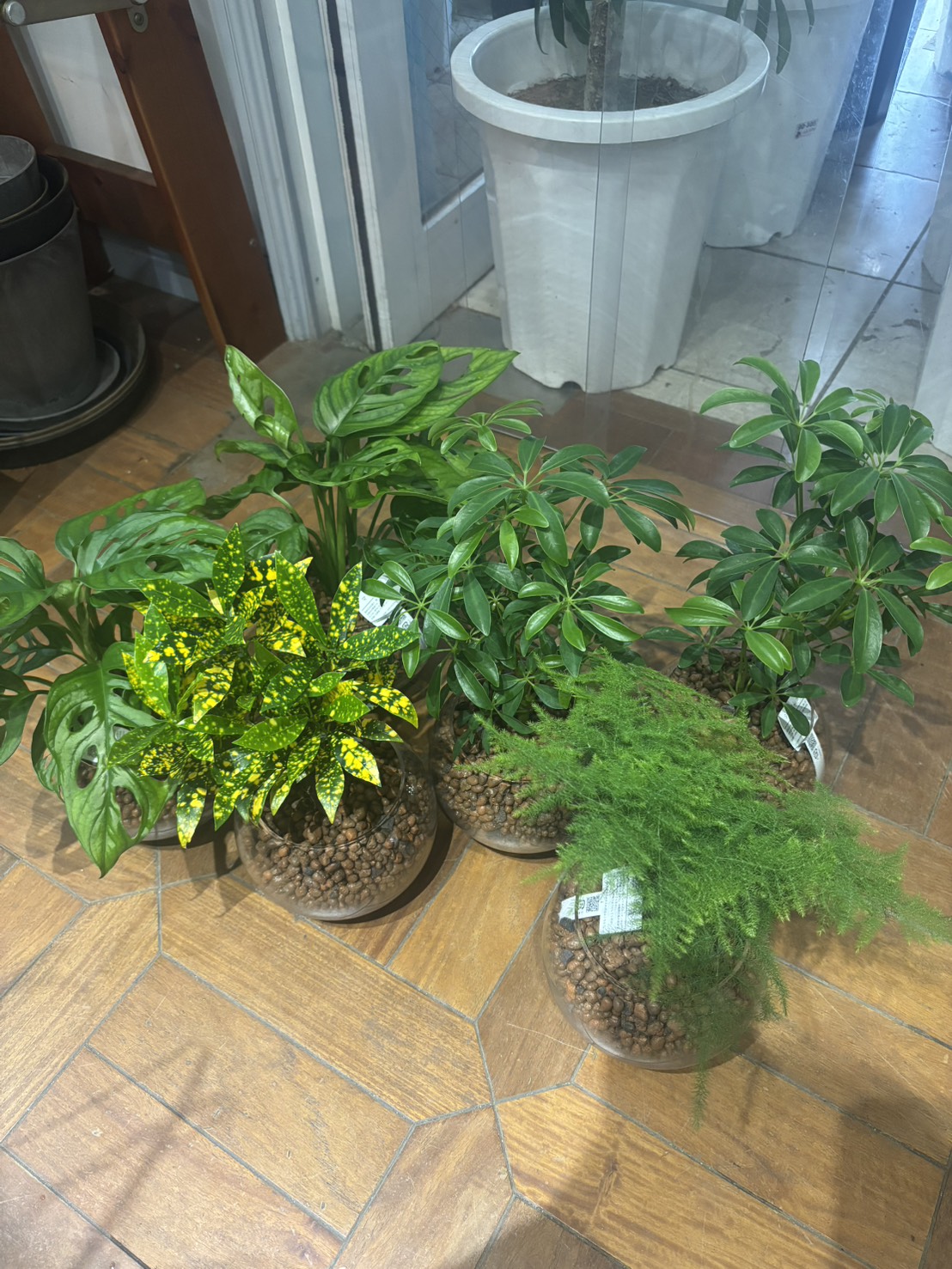 アスパラ・ナナス、クロトン・アキュビフォリア、シェフレラ・コンパクタ×2、マドカズラ×2